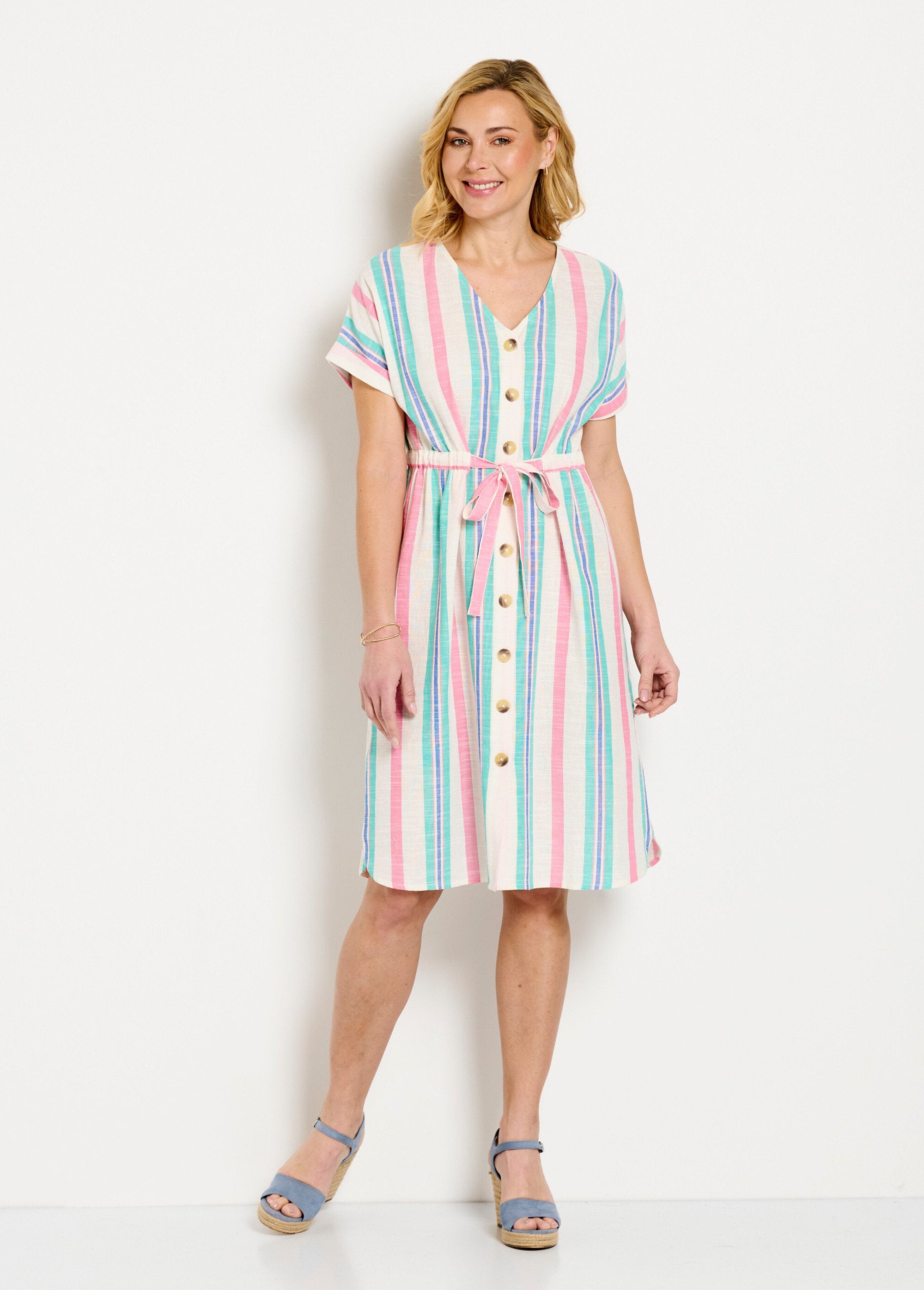 Trendy stripes in soft tones. The perfect length to flatter your legs. A cut that fits petite and plus sizes alike... This is the perfect dress for a casually chic summer. Wear heeled sandals for a city look, or flat mules for a vacation look.